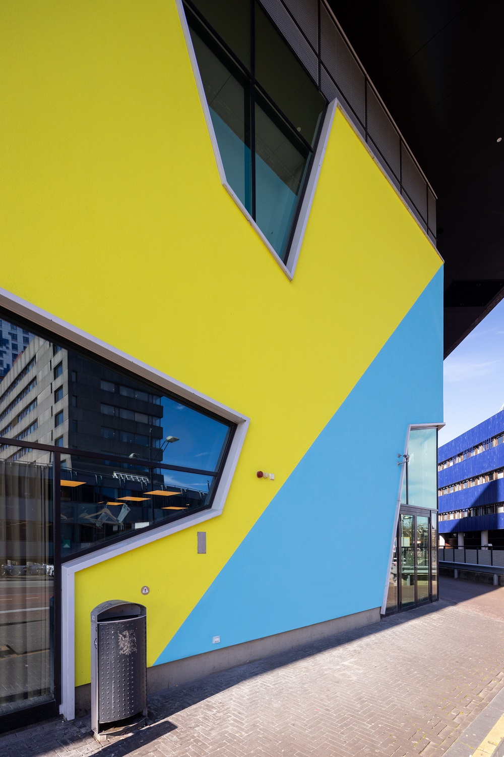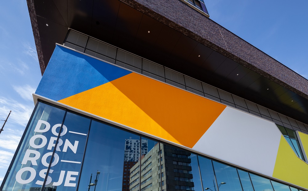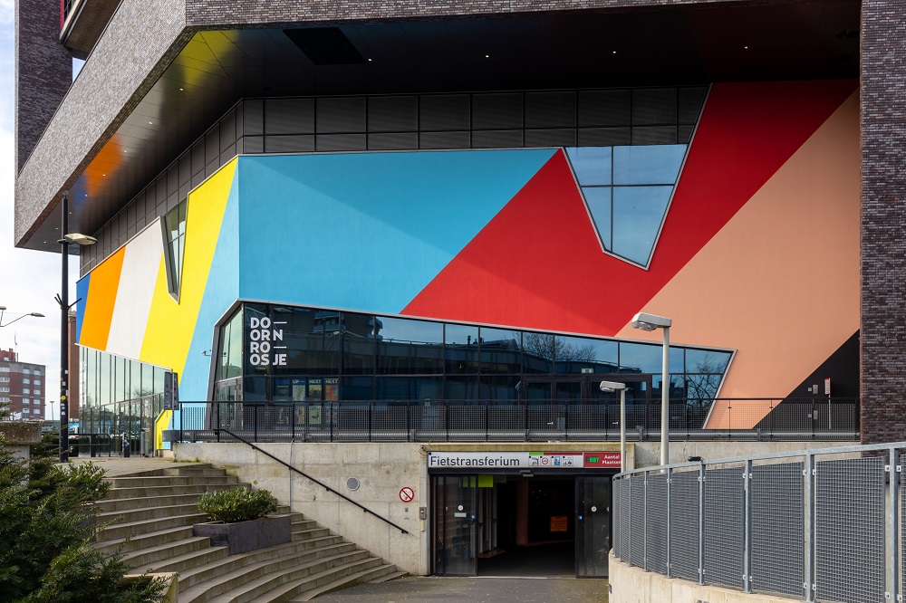 Der legendäre Liveclub „Doornroosje“ prägt seit 1968 die Musikszene von Nijmegen. 2014 zog er in die drei Sockelgeschosse eines modernen Neubaus am Bahnhof. Doch das geplante Fassaden-Farbkonzept eines Künstlers blieb vorerst unvollendet. Erst 2023 konnte es endlich umgesetzt werden: Mit kräftigen, diagonalen Balken in zehn LGBTQ+-inspirierten Farbtönen erstrahlen die unteren Club-Geschosse nun in voller Pracht und geben dem Gebäude seine kulturelle Stimme nach außen.